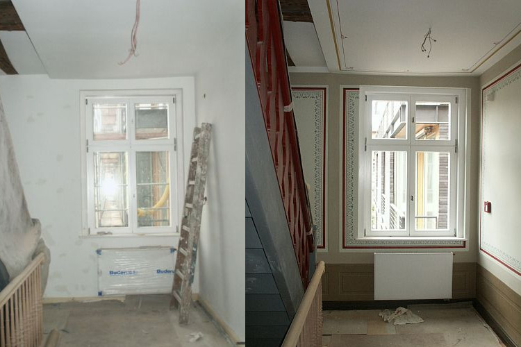 Hotel im Holländerhaus “Zum Hofmaler”, Potsdam Unterer Flur – Vor- und Endzustand Treppe zum 1. OG, Vorzustand (1.Bild) und beginnende Vorarbeiten (2.Bild) Treppe zum 1. OG, Beginn Sockelgestaltung (1.Bild) und fertige Sockelkassettierung (2.Bild) Treppenpodest 1. OG, Vorarbeiten (1.Bild), Beginn Sockelgestaltung (2.Bild) und fertige Sockelkasettierung (3.Bild) Treppenpodest 1. OG, Fensterwand zum Hof, Vorarbeiten (1.Bild) und fertiggestellter Podestbereich (2.Bild) Ehemaliger Flur im 2. OG, Vorzustand (1.Bild) und jetziges Bad des Kaminzimmers (2.Bild) Zukünftiges Kaminzimmer als Bauunterkunft (1.Bild) und Kaminzimmer mit illusionistischem Paneel (2.Bild) Marmorimitation Kaminkorpus und Wandgestaltung Ausschnitt Paneelgestaltung Detail Kasettierung